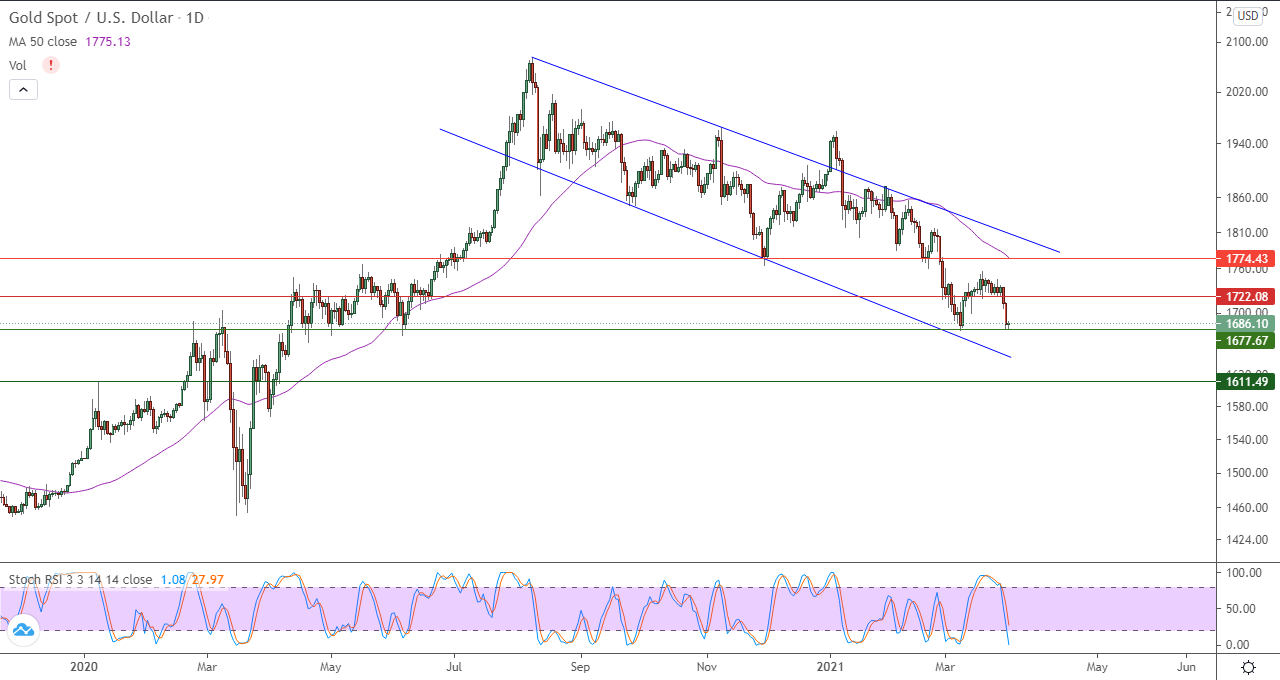 خلال تداولاته الأخيرة وصل المعدن الثمين إلى الاستناد لمستوى الدعم المحوري 1,678 ما أكسبه بعضاً من الزخم الإيجابي على إثر ثبات هذا المستوى حتى تلك اللحظة، وسط وصول مؤشرات القوة النسبية لمناطق شديدة التشبع بعمليات البيع.