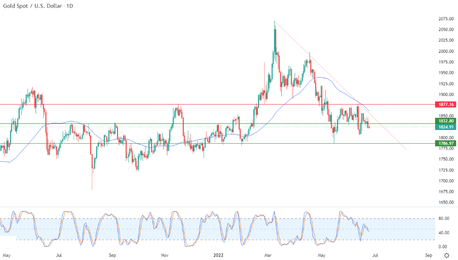 لهذا فتوقعاتنا تشير إلى المزيد من الانخفاض للذهب خلال تداولاته القادمة، خاصة طوال استقراره دون مستوى 1,832.80، ليستهدف مستوى الدعم المحوري 1,787.