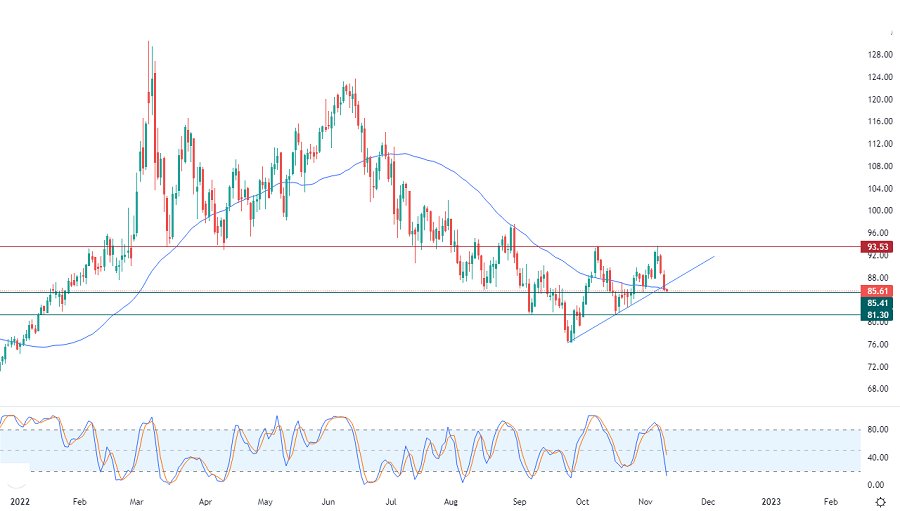 يأتي انخفاض النفط وسط توارد الإشارات السلبية بمؤشرات القوة النسبية، ليتخطى دعم خط ميل تصحيحي صاعد على المدى القصير، بالتزامن مع تخطيه أيضاً لدعم متوسطه المتحرك البسيط لفترة 50 يوماً السابقة، كما هو موضح بالرسم البياني المرفق لفترة زمنية (يومية)، ليصل إلى الاستناد لدعم مستوى الدعم المهم 85.40.