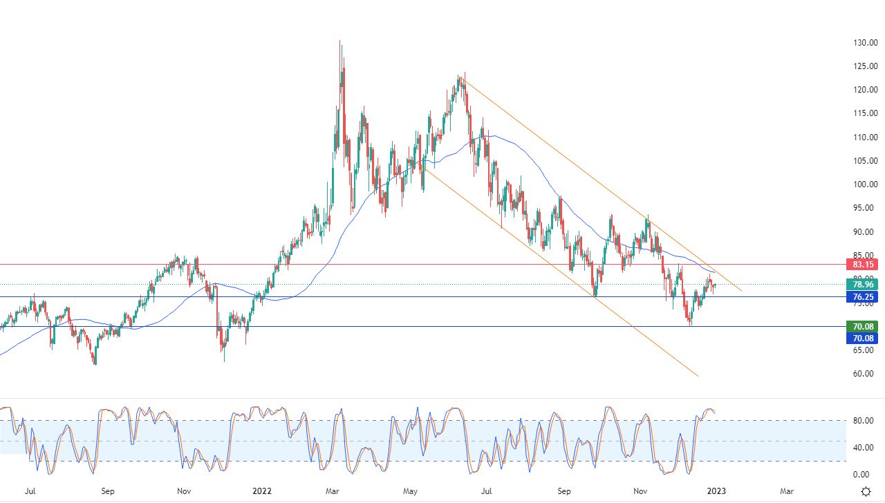 لهذا فتوقعاتنا تشير إلى انخفاض النفط خلال تداولاته القادمة، خاصة في حالة كسره للدعم 76.25، ليستهدف بعدها مستوى الدعم 70.00.