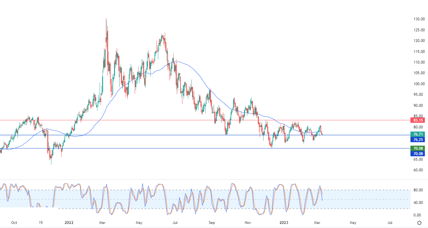 لهذا فتوقعاتنا تشير إلى انخفاض النفط خلال تداولاته القادمة، خاصة في حالة كسره للدعم 76.25، ليستهدف بعدها مستوى الدعم المحوري 72.00.