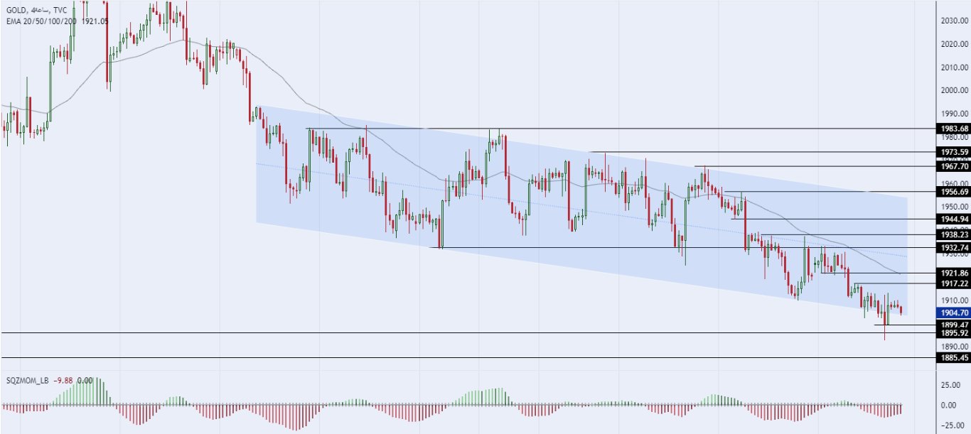 تداول سعر الذهب بشكل متباين خلال التداولات المبكرة صباح اليوم، حيث يتداول الذهب حول الحد السفلي للقناة السعرية الهابطة على الإطار الزمني للأربع ساعات، والموضحة من خلال الرسم البياني والتي استقر في التداول داخل نطاقها على مدار عدة أسابيع سابقة. في الوقت الحالي، يتداول السعر أقل من مستويات المقاومة التي تتركز عند 1917 و1921 على التوالي. في نفس الوقت يتداول الذهب اعلى مستويات الدعم التي تتركز عند 1895 و1885 على التوالي. كما يتداول السعر أقل من متوسط الحركة 50 على الإطار الزمني لليوم كذلك على الإطار الزمني للأربع ساعات في إشارة للتحول الهابط الذي يسجله سعر الذهب على المدى المتوسط. كما يشير مؤشر الزخم لتواصل سيطرة الاتجاه الهابط، يتوقع أن يستمر الذهب في التباين طالما استقر داخل نطاق القناة السعرية الهابطة.