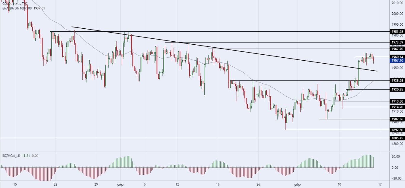 تقنيا، تباينت تداولات الذهب خلال التداولات المبكرة صباح اليوم، حيث اخترق السعر خط الاتجاه الهابط على الإطار الزمني للأربع ساعات والموضح من خلال الرسم البياني. في الوقت الحالي، يتداول السعر أقل من مستويات المقاومة التي تتركز عند 1960 و1967 على التوالي. في نفس الوقت يتداول الذهب أعلى مستويات الدعم التي تتركز عند 1938 و1930 على التوالي. كما يتداول السعر أعلى من متوسط الحركة 50 على الإطار الزمني لليوم، كذلك على الإطار الزمني للأربع ساعات في إشارة للاتجاه العام الصاعد الذي يسجله سعر الذهب على المدى المتوسط. يشير مؤشر الزخم لتحول الزخم إلى الصعود. حيث يتوقع أن يستمر الذهب في الارتفاع حتى وان سجل بعض التراجع التصحيحي