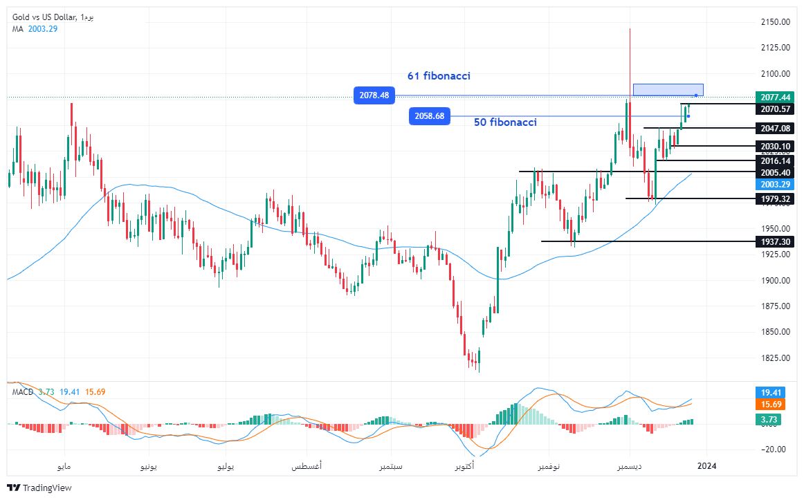 تقنيا، على صعيد تحليل أسعار الذهب تباين سعر الذهب خلال تداولات اليوم المبكرة، حيث ارتد الذهب من مناطق العرض القوية والتي تتكون بداية من مستوى 61 فيبوناتشي عند مستويات 2078 للموجة الهابطة التي تكونت القمة الخاصة بها في يوم 3 ديسمبر الجاري بينما تم تسجيل القاع عند يوم 13 ديسمبر/كانون الأول. تمدد مستويات العرض القوية حتى مستويات 2090 على الجانب الاخر في حال تراجع الزوج فنه يستهدف مستويات الدعم التي تتركز عند 2050 و2030 على التوالي.