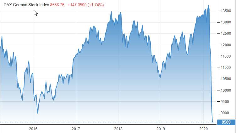 يبدو أن الأسهم الأوروبية تمدد الخسائر الأخيرة يوم الخميس على الرغم من أعلن البنك المركزي الأوروبي عن إطلاق خطة شراء سندات طارئة بقيمة 750 مليار يورو (820 مليار دولار)، وقد غردت رئيسة البنك المركزي الأوروبي كريستين لاجارد: "الأوقات الاستثنائية تتطلب إجراءات استثنائية. لا توجد حدود لحفاظنا علي اليورو". ومع ذلك، قال البنك المركزي الأوروبي إن ما يسمى ببرنامج الشراء الطارئ مؤقت وسيتوقف عندما يُعتقد أن أزمة الفيروس الحالي قد انتهت، وبعد فترة وجيزة من إعلان البنك المركزي الأوروبي، دعا الرئيس الفرنسي إيمانويل ماكرون إلى مزيد من الإجراءات المالية من القادة الاوروبيين، كذلك أعلنت ألمانيا مليار يورو (1.1 مليار دولار) في شكل ائتمان للشركات من جميع الأحجام من خلال بنك التنمية التجارية KfW المملوك للدولة، وقال أندرو بيلي، محافظ بنك إنجلترا، يوم الأربعاء إن البنك المركزي مستعد لما يلزم لدعم الاقتصاد وسط الصدمة الشديدة التي يسببها انتشار الفيروس الحالي، تراجعت الأسواق الأوروبية يوم الأربعاء مع تزايد المخاوف بشأن ركود وشيك تفوق علي إعلانات التحفيز من الحكومات والبنوك المركزية، حيث تراجع مؤشر ستوكس 600 الأوروبي بنسبة 3.9 في المائة. وانخفض مؤشر داكس الألماني 5.6 في المائة، وانخفض مؤشر كاك 40 الفرنسي 5.9 في المائة، وانخفض مؤشر فاينانشال تايمز 100 البريطاني 4.1 في المائة.
