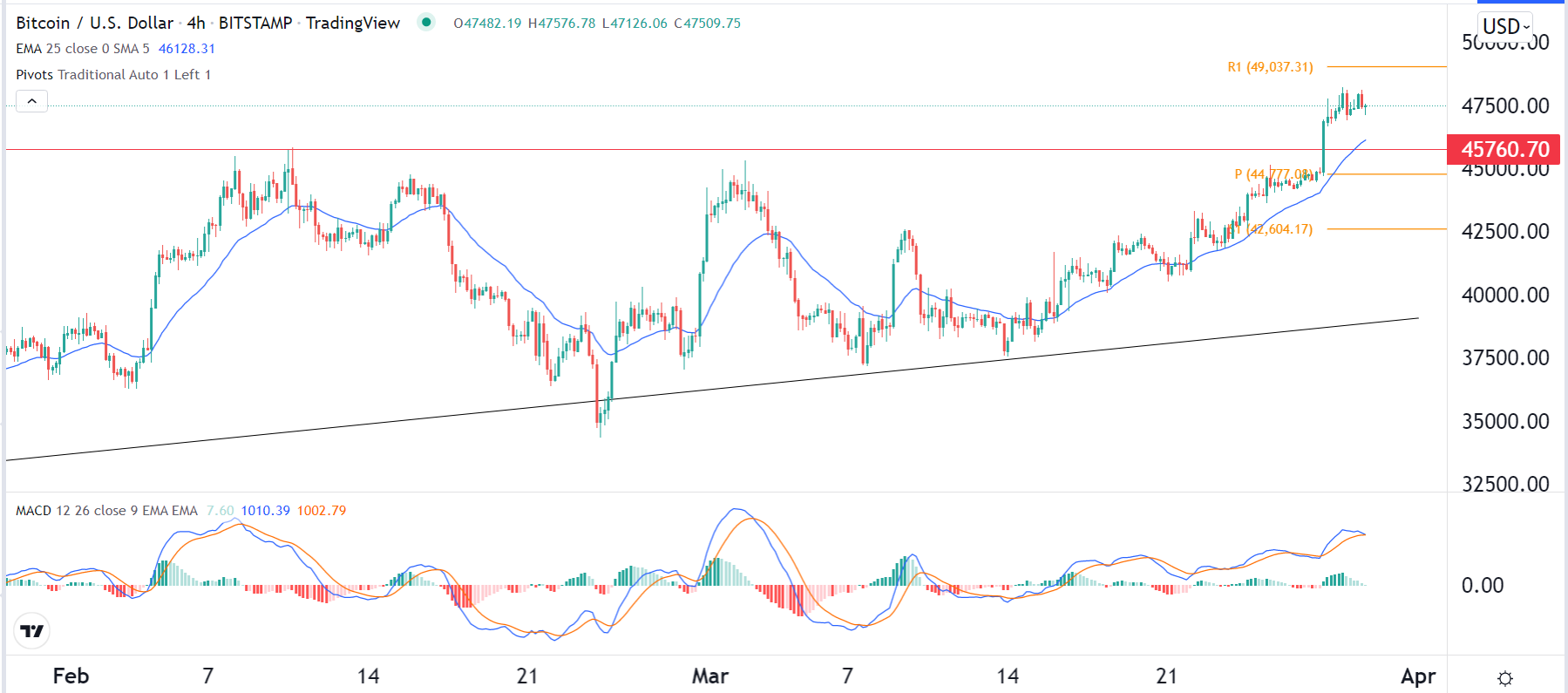 تلاشى ارتفاع زوج العملات البيتكوين مقابل الدولار الأمريكي في اليومين الماضيين حيث كافح للبقاء فوق مستوى المقاومة 48000. على الرسم البياني لأربع ساعات، لا يزال الزوج فوق مستوى المقاومة المهم عند 45760، والذي كان أعلى نقطة في 10 فبراير. الاتجاه الصعودي مدعوم أيضًا بالمتوسط المتحرك لـ 25 يومًا.