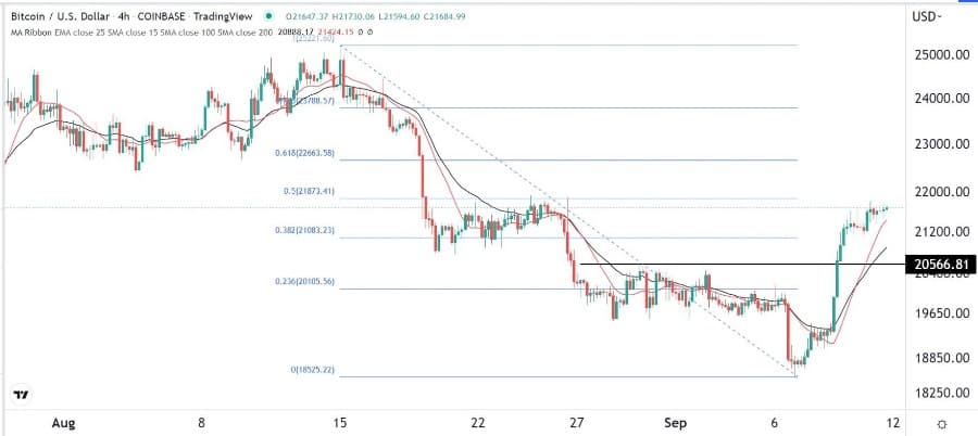 يظهر الرسم البياني لأربع ساعات أن زوج العملات البيتكوين مقابل الدولار الأمريكي كان في اتجاه قوي نحو الصعود في الأيام القليلة الماضية. في هذه الفترة، تمكن الزوج من التحرك فوق مستوى المقاومة المهم عند 20566، والذي كان أعلى نقطة في 30 أغسطس. انتقل الزوج أيضًا إلى مستوى تصحيح فيبوناتشي 38.2٪ والمتوسطات المتحركة لـ 25 يومًا و 50 يومًا.