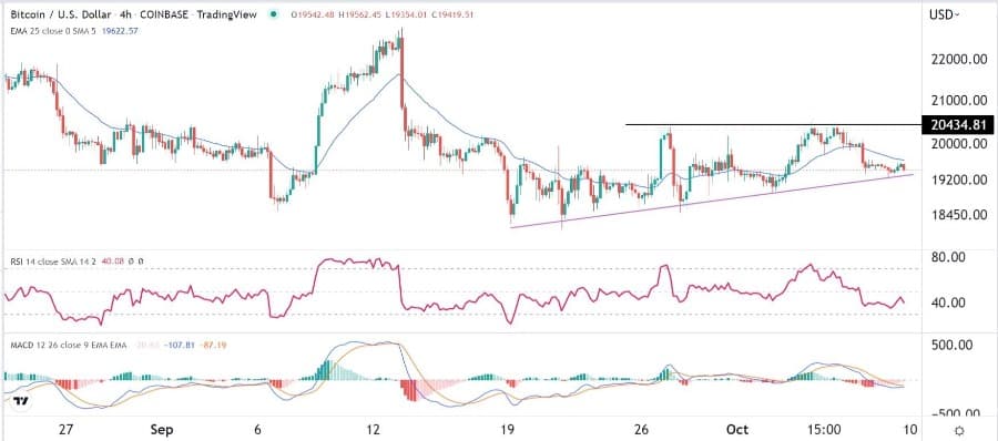 يظهر الرسم البياني لأربع ساعات أن سعر زوج العملات البيتكوين مقابل الدولار الأمريكي كان في نطاق ضيق مؤخرًا. وقد ظل حوالي 20 ألفًا في الأسابيع القليلة الماضية. تتماسك البيتكوين عند المتوسط ​​المتحرك لمدة 25 يومًا بينما يتحرك MACD أسفل النقطة المحايدة. تحرك مؤشر القوة النسبية (RSI) إلى ما دون المستوى المحايد عند 50. كما أنه أعلى قليلاً من خط الاتجاه نحو الصعود الموضح باللون البنفسجي.