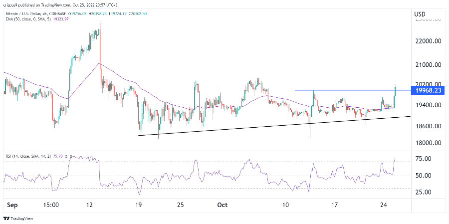 ارتفع سعر زوج العملات البيتكوين مقابل الدولار الأمريكي إلى أكثر من 20000 للمرة الأولى منذ 7 أكتوبر حيث انتعشت الأسهم الأمريكية وتراجعت عائدات السندات. ارتفع سعر البيتكوين إلى 20200 دولار مع تحسن الحالة المزاجية في السوق. كان هذا السعر أعلى بنحو 10٪ من أدنى مستوى لهذا الشهر.