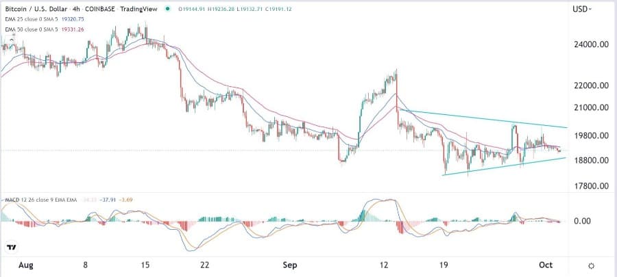 استمر سعر زوج العملات البيتكوين مقابل الدولار الأمريكي في التماسك حيث انتظر المستثمرون المحفز التالي. تم تداول عملة البيتكوين عند سعر 19200 دولار، حيث كان في الأسابيع القليلة الماضية. وانخفض بنحو 3٪ في سبتمبر مع ارتفاع مؤشر الدولار الأمريكي (DXY) إلى أعلى مستوى في أكثر من عقدين.