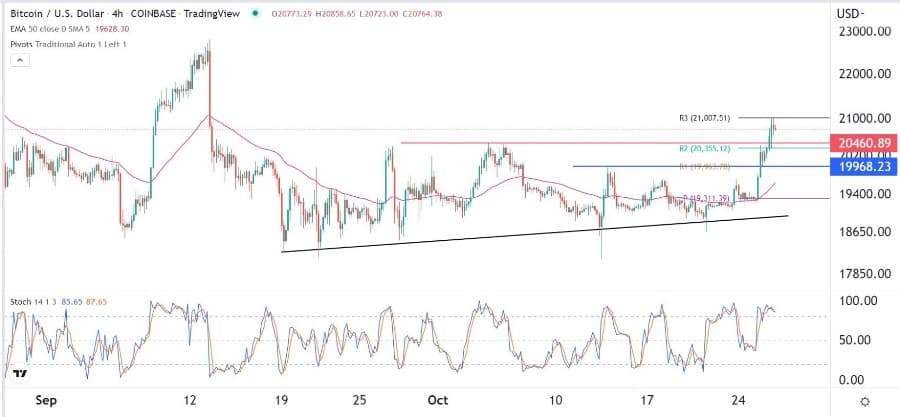 كان سعر عملة البيتكوين في مرحلة التدعيم في الأسابيع القليلة الماضية. انتهى هذا التعزيز هذا الأسبوع مع استمرار عمليات البيع المكثفة لمؤشر الدولار الأمريكي. ارتفع فوق نقطة المقاومة المهمة عند 19968، والتي كانت أعلى نقطة في 13 أكتوبر. كما تحرك فوق المقاومة عند 20460، وهي أعلى نقطة في 5 أكتوبر.