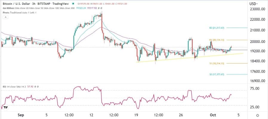 استمر سعر زوج العملات البيتكوين مقابل الدولار الأمريكي في الانفصال عن الأسهم الأمريكية في الجلسة المسائية. ظلت عملة البيتكوين ثابتة عند أقل من 20000 دولار بقليل حتى مع تراجع عوائد السندات ومؤشر الدولار الأمريكي وقفز الأسهم الأمريكية. تم تداول الزوج عند 19600 صباح يوم الثلاثاء.
