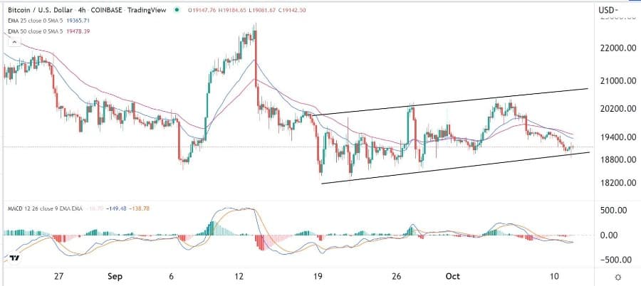 على الرسم البياني للأربع ساعات، نرى أن سعر زوج العملات البيتكوين مقابل الدولار الأمريكي كان في مرحلة تدعيم. في الآونة الأخيرة، شكل قناة في الاتجاه نحو الصعود يظهر باللون الأسود. إنه الآن في الجانب السفلي من هذه القناة. تحرك الزوج أيضًا أدنى المتوسطات المتحركة لـ 25 يومًا و 50 يومًا بشكل طفيف بينما انخفض MACD إلى ما دون النقطة المحايدة.
