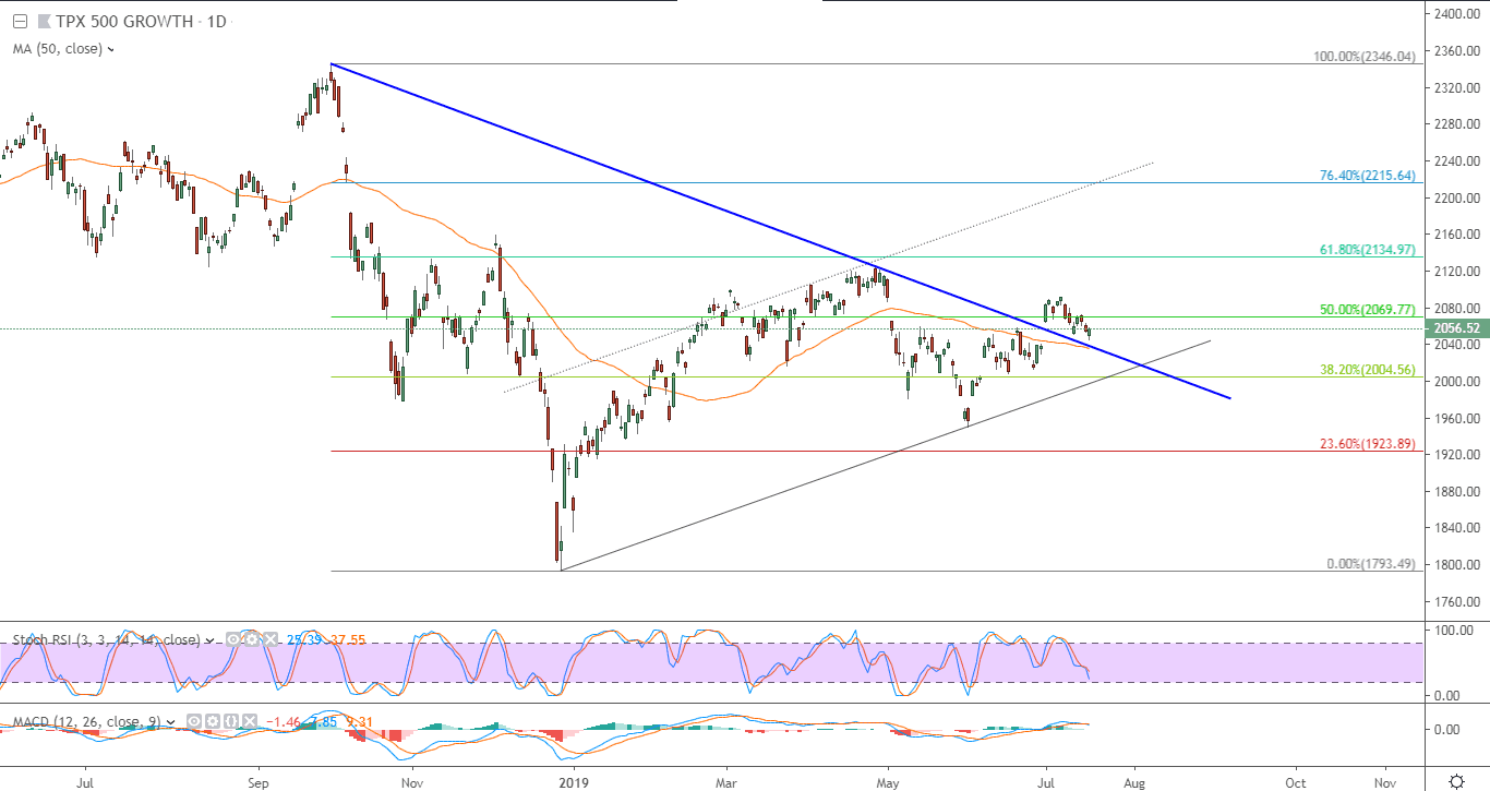 في البداية يتأثر مؤشر توبكس 500 (TOPIX 500) وهو المؤشر الأوسع انتشاراً بالسوق الياباني باختراقه لخط ميل رئيسي هابط في وقت سابق على المدى القصير كما هو موضح بالرسم البياني المرفق للمؤشر فترة (يومية)، وقد صعد في وقت سابق متأثراً بهذا الاختراق ليسجل أعلى مستوى له في بداية هذا الشهر عند 2091.25، ليستقر وقتها أعلى مستوى 2069.77، هذا المستوى الذي يمثل نسبة 50% من مستويات فيبوناتشي التصحيحية لآخر موجة هابطة على المدى المتوسط (من 2346.04 إلى 1793.49) .